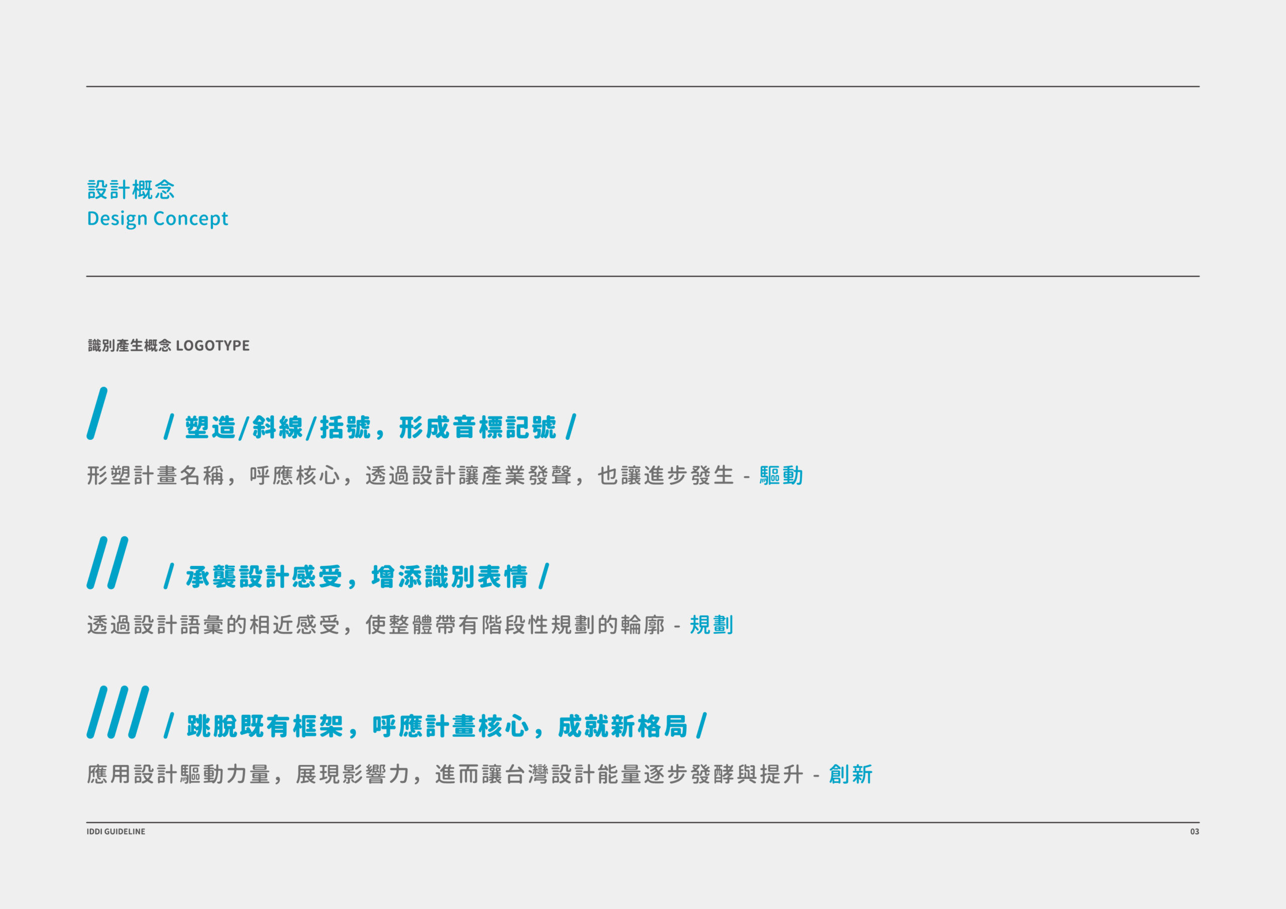 賦予標誌具有符碼的語意,強化出藉由設計替產業(相對應之內容)説話。利用設計跳脫以往計劃案的制式僵化,同時也展現藉由設計創造不同的可能。用創意提醒設計能將秩序的產業氛圍注入新的活力與創造下一個階段,讓不可能成為可能。